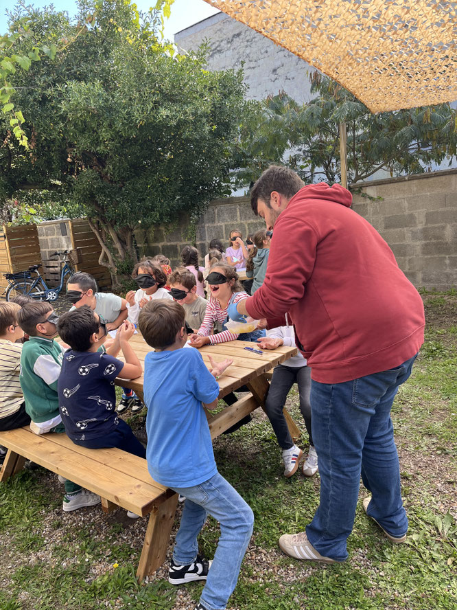 Ils ont aussi eu le plaisir de réaliser un Kim-goût. Ce jeu consiste à goûter des aliments les yeux bandés et à deviner ce que l’on vient de manger. Certains aliments étaient très agréables à déguster, comme le chocolat, le kiwi ou la pêche… Cependant, le citron, le sel ou encore le curry étaient beaucoup moins drôles à goûter ! Nous avons passé tous ensemble un moment très agréable.